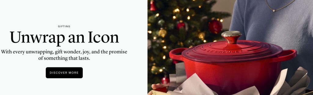 Le Creuset does this well. Their festive messaging is simple and strong, tying their products to moments that define the season, such as gift-giving, joy, and shared memories.