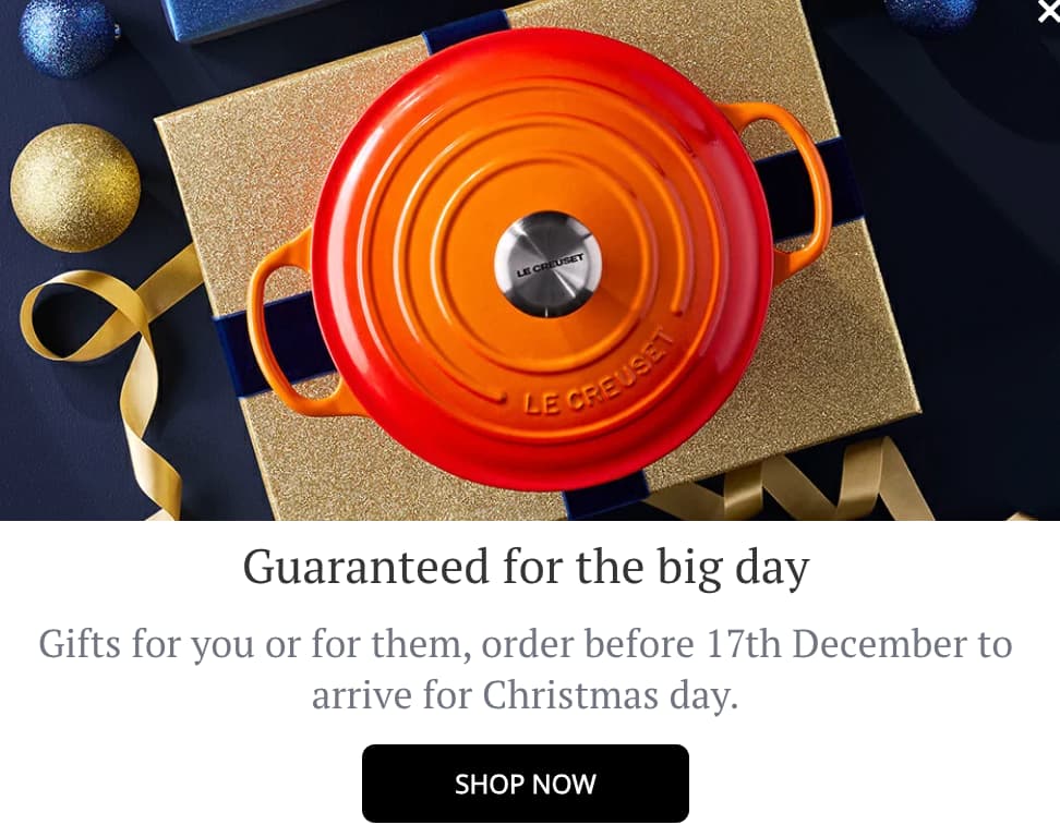 - Display an “Order by 15 December for pre-holiday delivery” banner or popup, even if it applies only to metro areas.