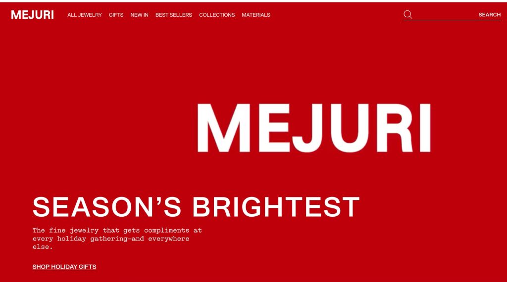 Mejuri’s festive hero shows how simple design can still feel seasonal. The red background and ribbon graphic create an instant holiday cue while keeping the look clean. The headline is confident, and the copy is focused on real festive moments. It is a reminder that you do not need a complex campaign. A substantial colour shift and a clear message can make your homepage feel festive and relevant.